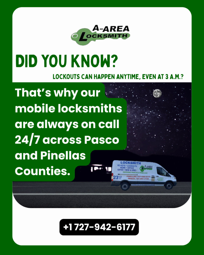 It’s late. You’re tired. You reach for your keys — and realize they’re locked inside. Whether it’s your home, car, or business, a lockout at 3 A.M. isn’t just inconvenient — it’s stressful, isolating, and potentially unsafe. That’s why A-Area Locksmith offers round-the-clock mobile locksmith service across Pasco and Pinellas Counties.