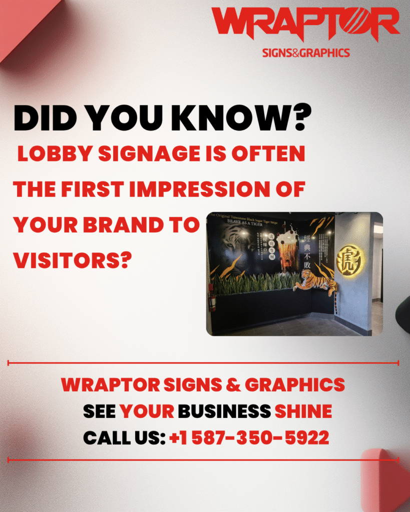 Your lobby isn’t just a waiting area — it’s your brand’s handshake. The moment a client, partner, or guest walks in, your signage sets the tone. Wraptor Signs & Graphics specializes in custom lobby signage that blends bold design with brand storytelling, helping Calgary businesses make unforgettable first impressions.